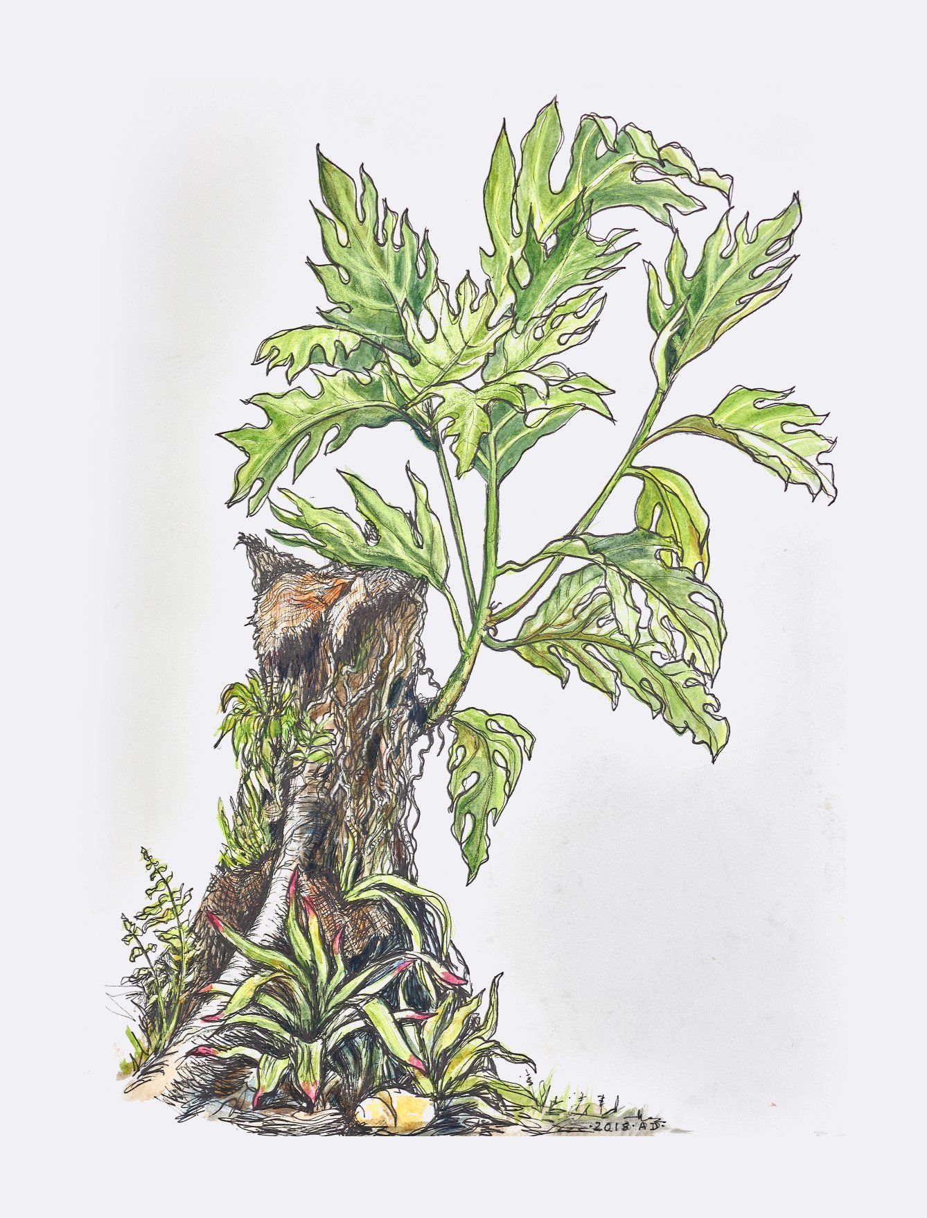 On St Patrick’s Day 2018 Cyclone Marcus raged across Darwin uprooting thousands of trees. We had an old Breadfruit tree in our garden which was only a couple of metres from the deck of our elevated house. The winds blew the tree against the deck necessitating its removal. When the arborist came to remove it I asked that they leave a substantial trunk as I planned to create a small arbour in that part of the garden which had hitherto been rather neglected. My husband and I planted the arbour then went about our lives giving little thought or attention to the stump and the plants adorning it. Then one day I noticed the tree had grown new small shoots of branches – evidence of the life still within. I thought this was a most apt depiction of what I was writing about in the book so commissioned one of Darwin’s Artists, Alison Dowell, to paint it for me. This is her painting.